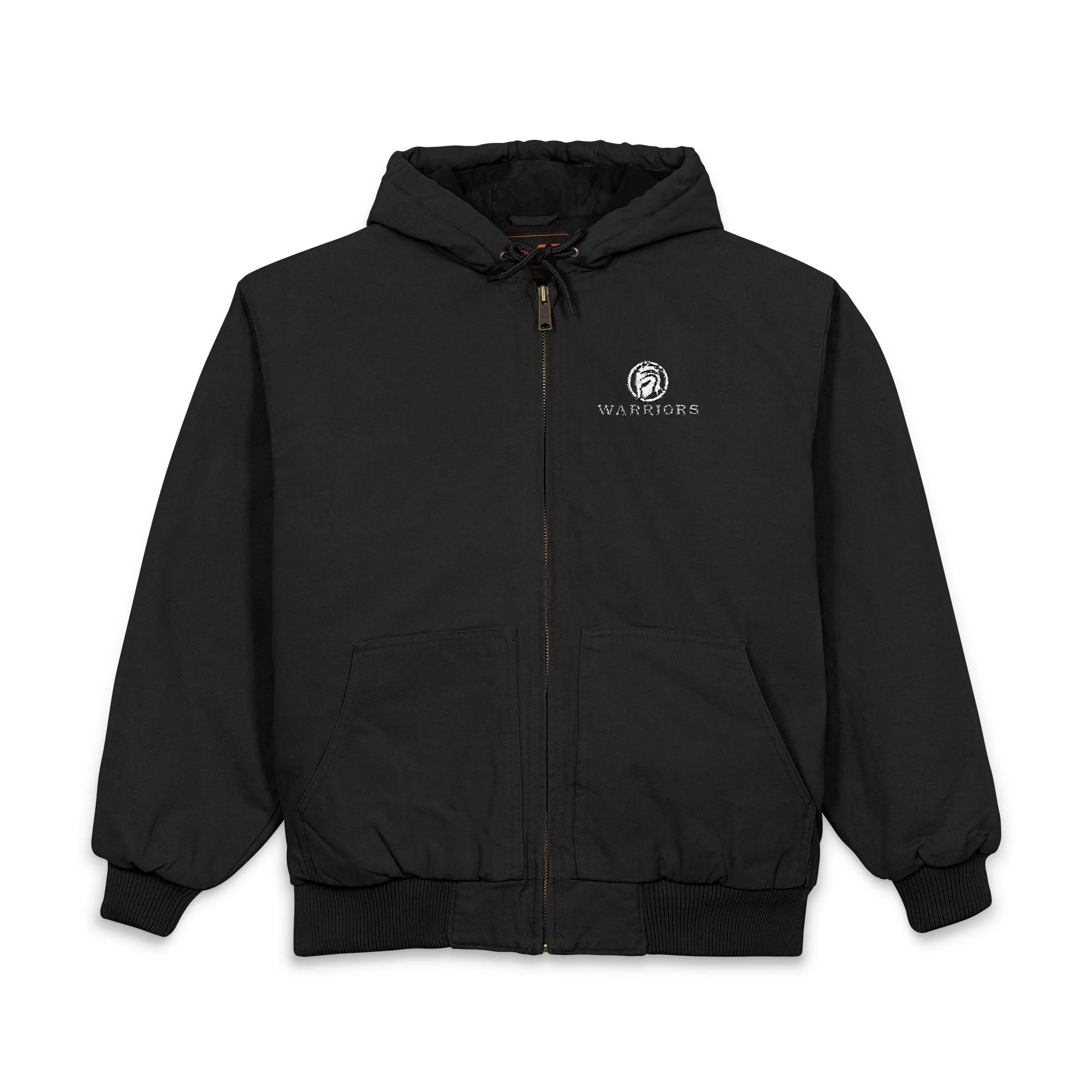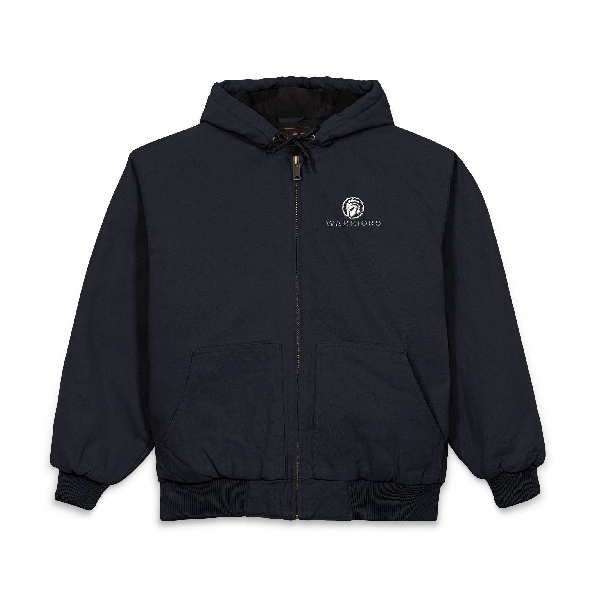 This heavyweight duck cloth hooded jacket brings dependable warmth and work-ready style to your everyday routine. Built from enzyme-washed 100% cotton, the fabric feels broken-in and soft while keeping a rugged structure that stands up to brisk mornings and tough tasks. A full zip and drawstring hood with antique brass eyelets add practical layering options; ribbed cuffs and waistband lock in warmth without restricting movement. Multiple pockets — roomy front pouches, an interior zip pocket, and a decoration access pocket — keep tools, phone, and small essentials close at hand. Subtle embroidered WARRIORS logo on the chest gives a handcrafted touch that complements the jacket’s utilitarian silhouette. It’s the kind of outerwear that settles into your life: hardworking, comfortable, and quietly polished.