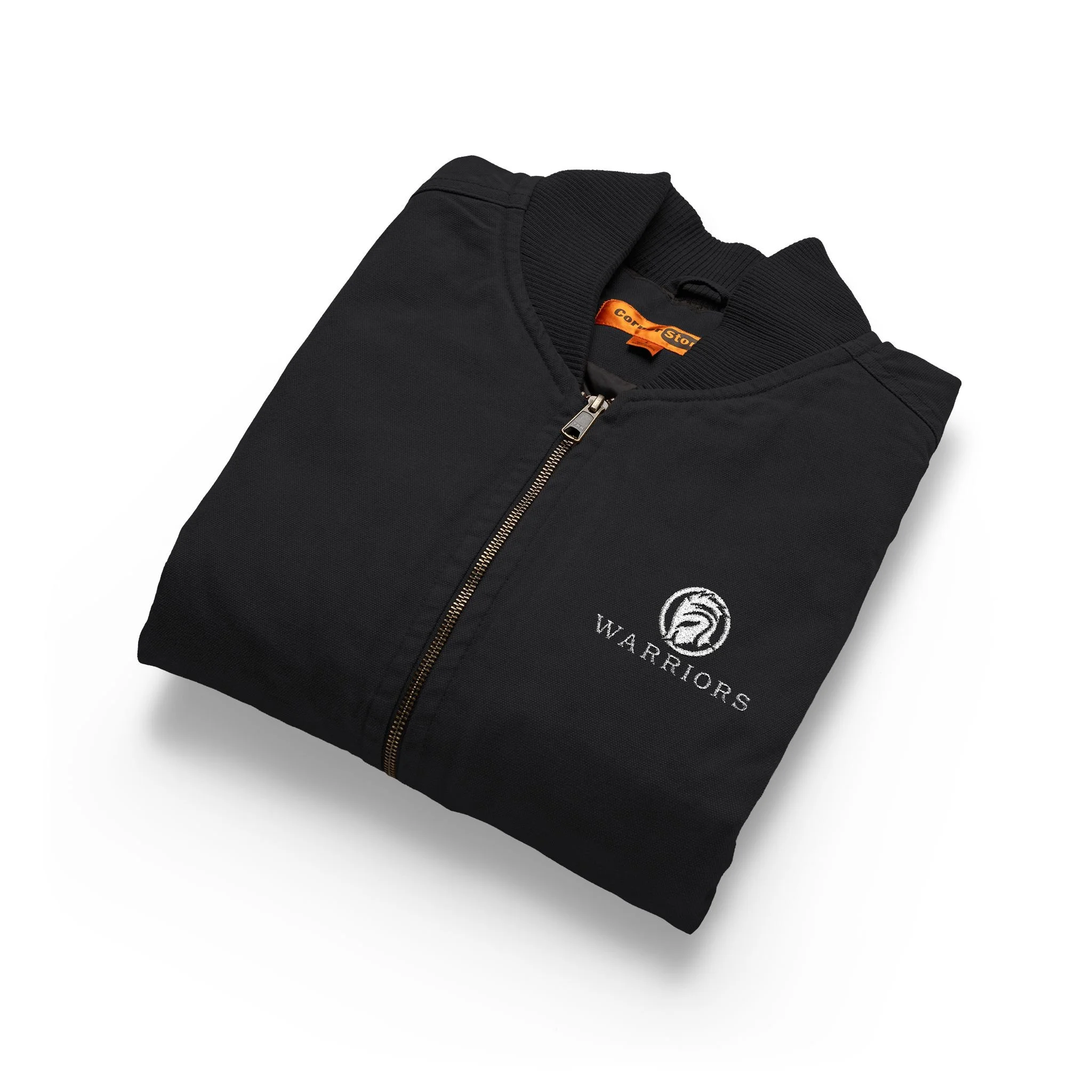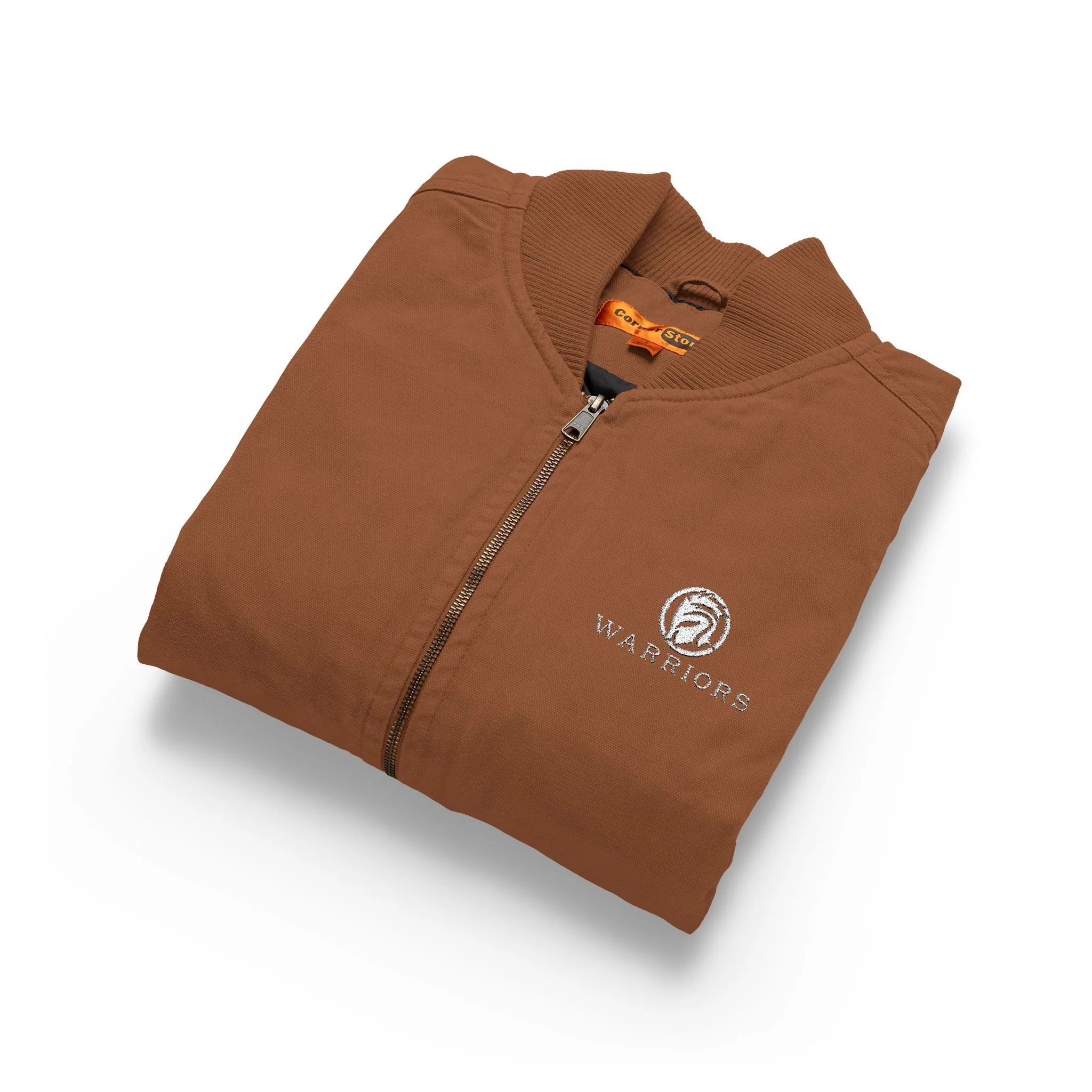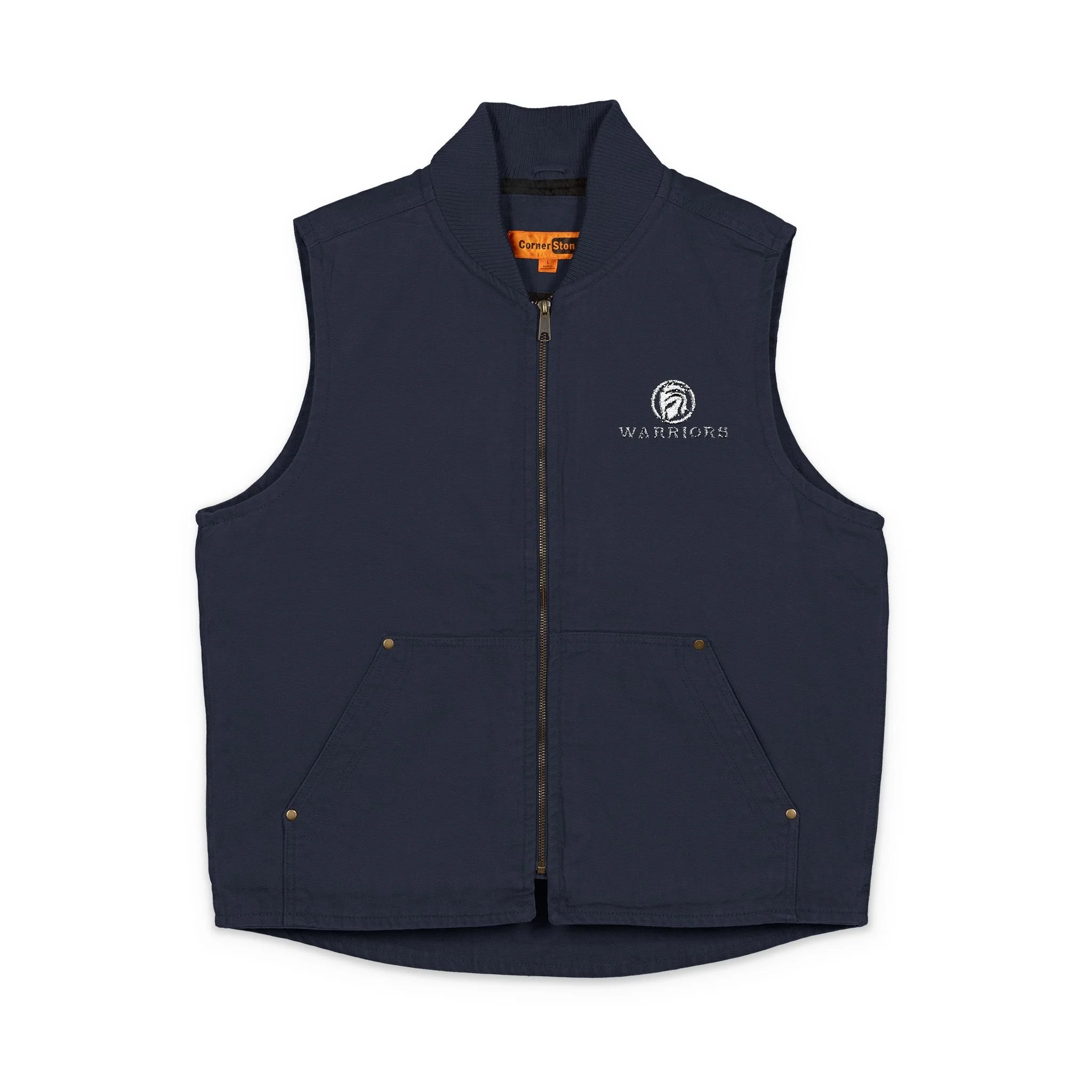 This rugged duck cloth vest brings reliable warmth and hardworking style to anyone who spends time outside or on the job. Built from 100% enzyme-washed cotton duck cloth, the heavyweight fabric breaks in with use and resists wear where it matters most. The rib knit collar and brass zipper keep drafts at bay, while front hand-warmer pockets and an interior pocket with hook-and-loop closure keep small essentials close. Metal rivets reinforce stress points for long-lasting durability. Subtle WARRIORS logo on the chest adds personality without overpowering the vest’s clean, utility-first silhouette. Wear it over a flannel on crisp mornings, layer it under a jacket for added warmth, or bring it to the jobsite where dependable gear matters.